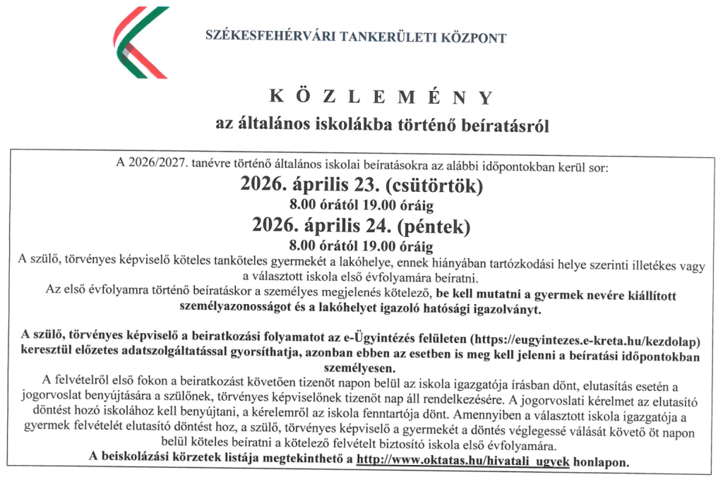 Általános iskola beíratás 2026.04.23, 04.24